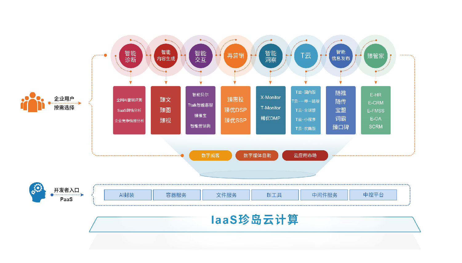 “應(yīng)用即場(chǎng)景,場(chǎng)景即多元?!眱?yōu)秀的企業(yè)級(jí)云服務(wù)平臺(tái),必須具備強(qiáng)大的“多場(chǎng)景應(yīng)用延展能力”,Marketingforce的開放性,面向不同的產(chǎn)業(yè)、行業(yè)、業(yè)務(wù)領(lǐng)域的中小微企業(yè)集群,提供了多元化的AI SaaS智能營(yíng)銷工具服務(wù)。目前珍島T云版圖已經(jīng)涵蓋了T云(標(biāo)準(zhǔn)版)、T云(一帶一路版)、T云(院校版),T云(農(nóng)商版)、T云(全球版)、T云(園區(qū)版)等不同的應(yīng)用方向,并得到了垂直領(lǐng)域企業(yè)客群的一致肯定。