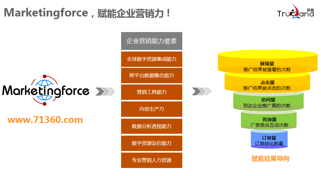 中小企業(yè)對(duì)數(shù)字化營(yíng)銷“需求很強(qiáng),但控制力很弱”。因此需要尋找匹配的入口實(shí)現(xiàn)營(yíng)銷力賦能。珍島全球首推“Marketingforce(營(yíng)銷力賦能)” 服務(wù)模型,以AI-SaaS為硬核,構(gòu)建全球領(lǐng)先的智能營(yíng)銷云平臺(tái)。面向中小微企業(yè)核心訴求,Marketingforce幫助企業(yè)解決全球數(shù)字資源集成、跨平臺(tái)數(shù)據(jù)整合、營(yíng)銷工具集成、內(nèi)容生產(chǎn)力打造、數(shù)據(jù)分析透視以及數(shù)字資源議價(jià)等數(shù)字營(yíng)銷系統(tǒng)性問(wèn)題。