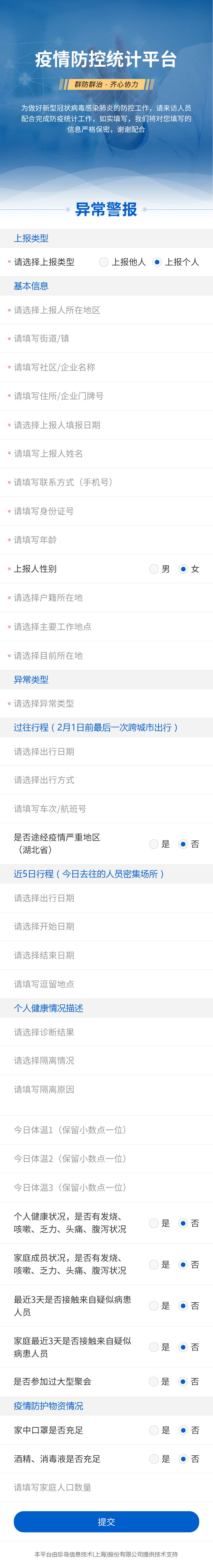 通過“珍島防疫跟蹤系統(tǒng)”,可以高效信息化手段對企業(yè)員工、來訪客戶(企業(yè)/園區(qū))、學校師生等進行近期健康情況跟蹤,通過在線提交健康信息與統(tǒng)計,實時上報人員健康情況,后臺健康統(tǒng)計與管理,及時掌握人員信息健康動態(tài),在確保數(shù)據(jù)安全、高效流通的同時,降低人員感染風險,以便針對異常情況及時做出應對與處理,全面、有效助力抗擊疫情!