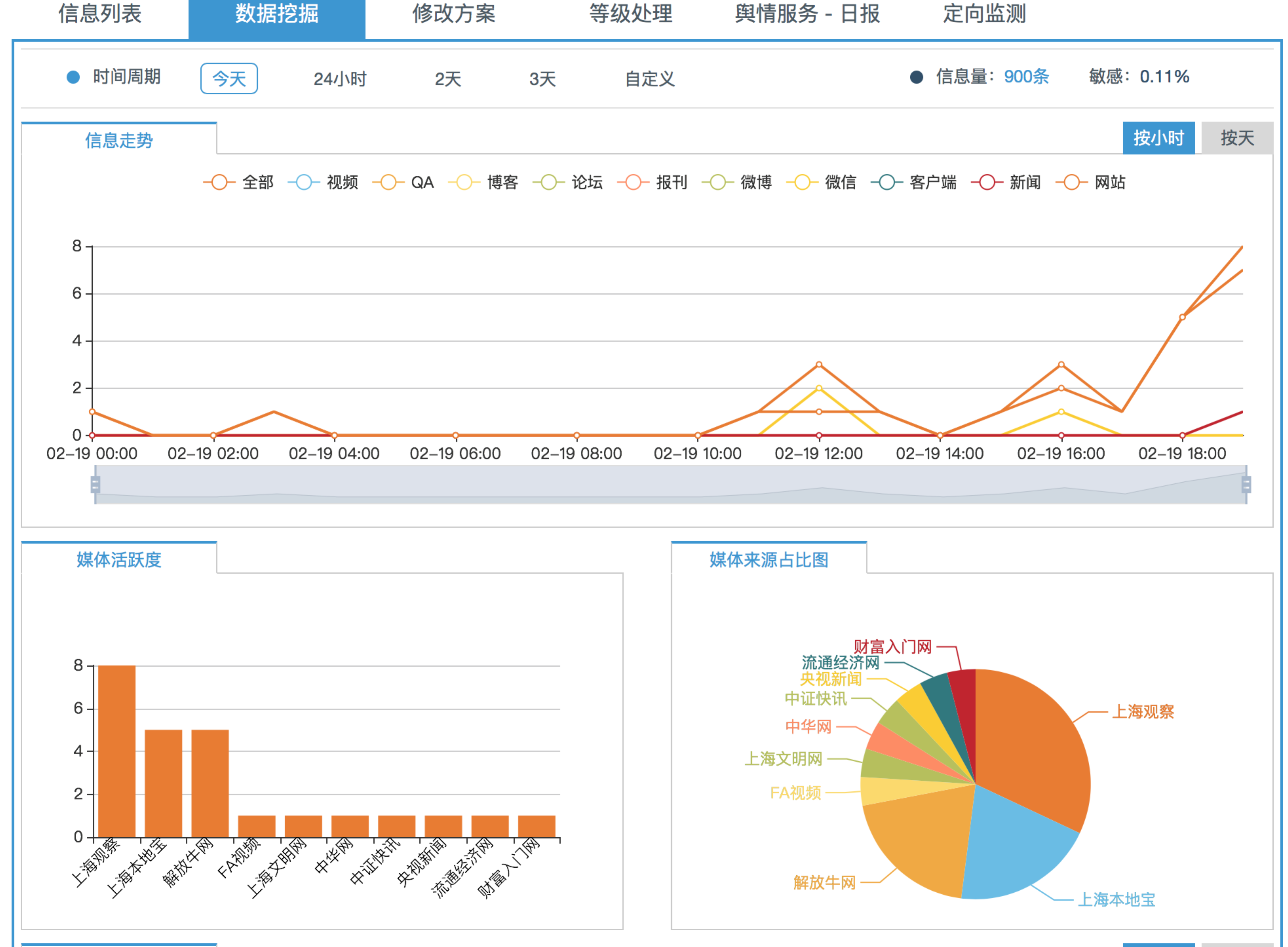防疫工作期間,實(shí)時(shí)輿情平臺(tái)協(xié)助完成互聯(lián)網(wǎng)信息多元化集成,輿情“元數(shù)據(jù)”來源于互聯(lián)網(wǎng)各搜索引擎、社交平臺(tái)、論壇、網(wǎng)盟及各信息分享平臺(tái)等,應(yīng)用機(jī)器學(xué)習(xí)反復(fù)修正;自定義監(jiān)測(cè)計(jì)劃方案設(shè)定后,實(shí)時(shí)觀察熱點(diǎn)內(nèi)容傳播量級(jí),基于關(guān)注度與傳播度,判斷輿情的處理預(yù)案和快速反饋響應(yīng)措施。輿情信息數(shù)據(jù)最終以專業(yè)可視化交互形式進(jìn)行輸出。