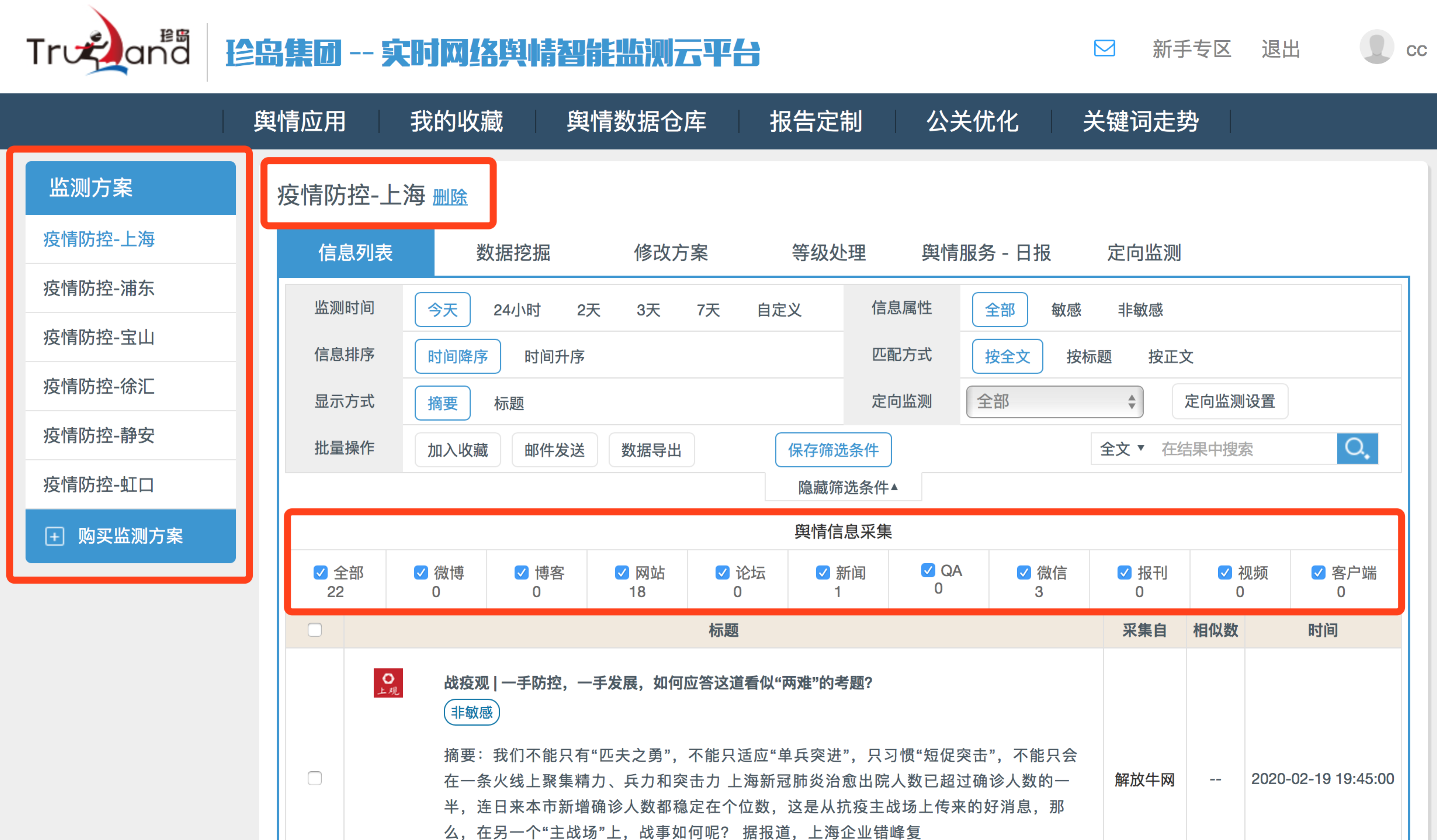 為更好的配合、協(xié)助防疫期間各級(jí)部門的工作需要,在疫情防控新技術(shù)、新系統(tǒng)應(yīng)用領(lǐng)域,珍島堅(jiān)持快速部署,快速服務(wù)的原則,迅速完成實(shí)時(shí)網(wǎng)絡(luò)輿情智能監(jiān)測(cè)云平臺(tái)的升級(jí)工作,面向全國各級(jí)需求部門落地服務(wù)供應(yīng)。