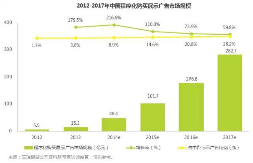 另據(jù)艾瑞調(diào)研預(yù)計(jì),2017年中國(guó)程序化購(gòu)買市場(chǎng)整體規(guī)模將達(dá)到282.7億元,占中國(guó)展示廣告市場(chǎng)的比例將達(dá)到28.2%。