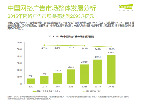 據(jù)艾瑞咨詢數(shù)據(jù)顯示,中國(guó)網(wǎng)絡(luò)廣告(數(shù)字營(yíng)銷)市場(chǎng)規(guī)模達(dá)到2093.7億元,預(yù)計(jì)2018年整體規(guī)模有望突破4000億元。2015年中國(guó)市場(chǎng)網(wǎng)絡(luò)廣告規(guī)模已經(jīng)達(dá)到電視和廣播廣告規(guī)模的兩倍。趙旭隆的演講從一組數(shù)據(jù)開始,表明國(guó)內(nèi)數(shù)字營(yíng)銷市場(chǎng)的規(guī)模正在不斷攀升,同時(shí)數(shù)字營(yíng)銷比重也已經(jīng)超越傳統(tǒng)營(yíng)銷,成為受廣告主青睞的營(yíng)銷方式。