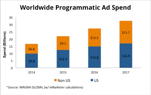談到“脫困”的方法,趙旭隆認(rèn)為程序化廣告購(gòu)買是“救命稻草”,他從全球程序化購(gòu)買的趨勢(shì)說起。據(jù)Magna Global的數(shù)據(jù)顯示,2017年全球程序化廣告市場(chǎng)規(guī)模將達(dá)到327億。