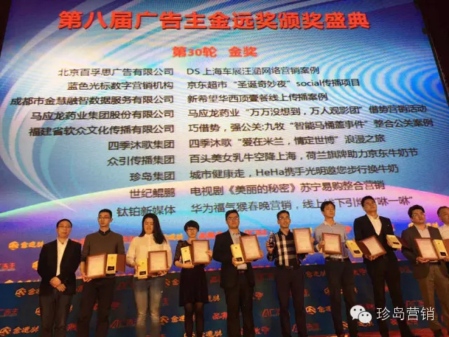 “中國(guó)廣告主金遠(yuǎn)獎(jiǎng)”取意“廣告點(diǎn)石成金,品牌高聲致遠(yuǎn)”,是由廣告主網(wǎng)、《廣告主》雜志品微會(huì)主辦,中國(guó)傳媒大學(xué)MBA學(xué)院提供學(xué)術(shù)支持,是結(jié)合本土實(shí)際打造的大中華區(qū)營(yíng)銷傳播領(lǐng)域的權(quán)威獎(jiǎng)項(xiàng);峰會(huì)與國(guó)際全面接軌,邀請(qǐng)業(yè)內(nèi)知名人士擔(dān)當(dāng)各類獎(jiǎng)項(xiàng)的評(píng)審,所有獎(jiǎng)項(xiàng)經(jīng)過(guò)嚴(yán)格、科學(xué)、公正的評(píng)審程序。珍島集團(tuán)此次包攬六項(xiàng)大獎(jiǎng),與十多年來(lái)的執(zhí)著創(chuàng)新密不可分,也標(biāo)志著珍島集團(tuán)在行業(yè)內(nèi)領(lǐng)軍企業(yè)的地位。