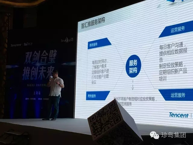 珍島集團副總裁劉歡先生親臨現(xiàn)場并上臺發(fā)表演講,他率先闡述了目前廣告主在營銷推廣時所面臨的痛點,例如媒體資源難以取舍、數(shù)據(jù)難以應(yīng)用、目標受眾難以定位以及投放回報率難以把控等等,緊接著針對這些營銷痛點講述了騰訊智匯推在品牌提升、數(shù)據(jù)洞察、資源優(yōu)質(zhì)、創(chuàng)意智能及效果付費等不同維度的優(yōu)勢。