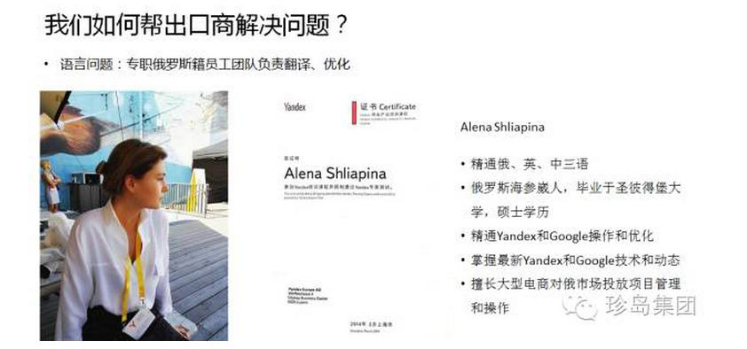 Yandex是俄羅斯市場(chǎng)占有率高的搜索引擎,被譽(yù)為進(jìn)入俄羅斯互聯(lián)網(wǎng)的門戶,珍島是早從事Yandex推廣服務(wù)的中國互聯(lián)網(wǎng)企業(yè)之一,經(jīng)過2年多的努力,珍島已經(jīng)形成了由中俄專業(yè)人士共同組成的專業(yè)對(duì)俄推廣團(tuán)隊(duì),在今年六月在柏林召開的Yandex全球?qū)<曳鍟?huì)上,珍島作為唯一的中國服務(wù)商代表受邀出席。