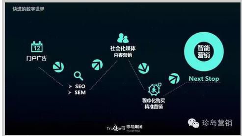 張蓬指出:“在這快速演變的20年中,不斷有新的技術和理念關鍵詞涌現(xiàn)而出,例如近熱門的‘去中介化’、‘去中心化’、 ‘場景化’、‘跨界融合’等,每一個詞都代表了一個時代,雖然這個時代并非很長?!?,自珍島在業(yè)界首提“智能營銷”的核心理念之時,營銷人開始有人支持,有人懷疑:在數(shù)字世界,智能營銷能真正落地么?